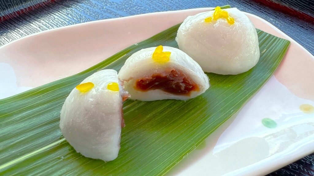 The mochi are small and delicate, with bright yellow rice grains accenting the pure white surface, creating a vivid contrast against the green of the bamboo leaf. The flavor features tender, pleasantly chewy mochi paired with lightly sweetened red bean paste, complemented by the subtle aroma of the bamboo leaf. Since no preservatives are used, Iga Mochi is best enjoyed on the day it is made.